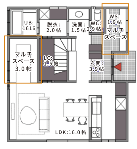 リビング横と玄関土間の2つのマルチスペースがあるプラン