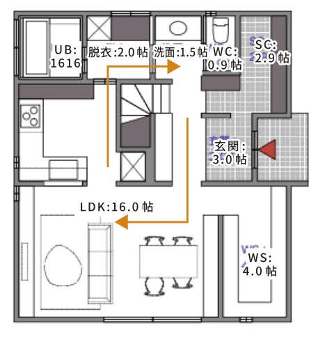 キッチンを中心に水廻り、リビングヘの移動のしやすさを考えたプラン