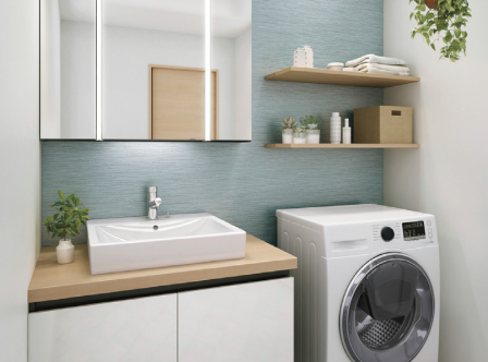 生活感のでる脱衣場と洗面スペースは分けて。プライベート空間で室内干しも可能です。 収納もしっかりと。オープン洗面で開放的に。