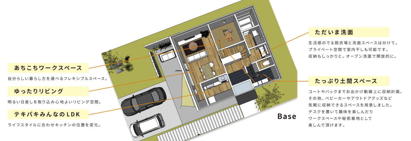 タタミスペースやフリースペース、子育てや家事のしやすさにこだわったプランなど